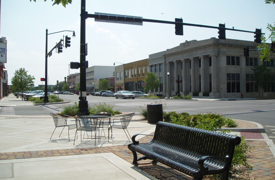 LandPlan assisted in providing a major renovation to downtown Norman. The designed area consisted of 3 blocks of Main Street from the Burlington Northern Santa Fe Railroad to Porter Avenue. The project consisted of new ADA accessible concrete sidewalks with cobblestone paver edging and diamond scored concrete at the corners. Curb extensions with planters at the intersections help to bring pedestrians farther out into the intersection for better visibility while crossing. The pavement in the intersections and at the crosswalks is made up of colored and stamped asphalt designed to look like cobblestone. Lacebark elm trees with tree grates line the street. Decorative traffic lights, street lights and pedestrian lights help to tie the project together. Benches, trash receptacles and ash urns were provided.