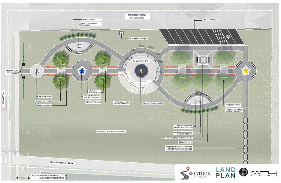 Skiatook Veterans Park provides a beautiful relaxing environment for visitors to celebrate the service and honor the sacrifice of United States military veterans. Curved paths guide visitors to focal points that recognize and honor veterans and their families. These focal points include a covered memorial pavilion, memorial bricks, and benches. Additionally, various monuments bring attention to the service and sacrifice of Blue Star mothers, Gold Star families, prisoners of war, and first responders. The park also brings awareness to the tragedy of veteran suicide. The heart of this design stands a flag courtyard, featuring each branch of the United States military, the United States and Oklahoma State Flag. Skiatook Veterans Park is centrally located on Main Street directly across from Central Park. ADA compliant parking is conveniently located at the park.